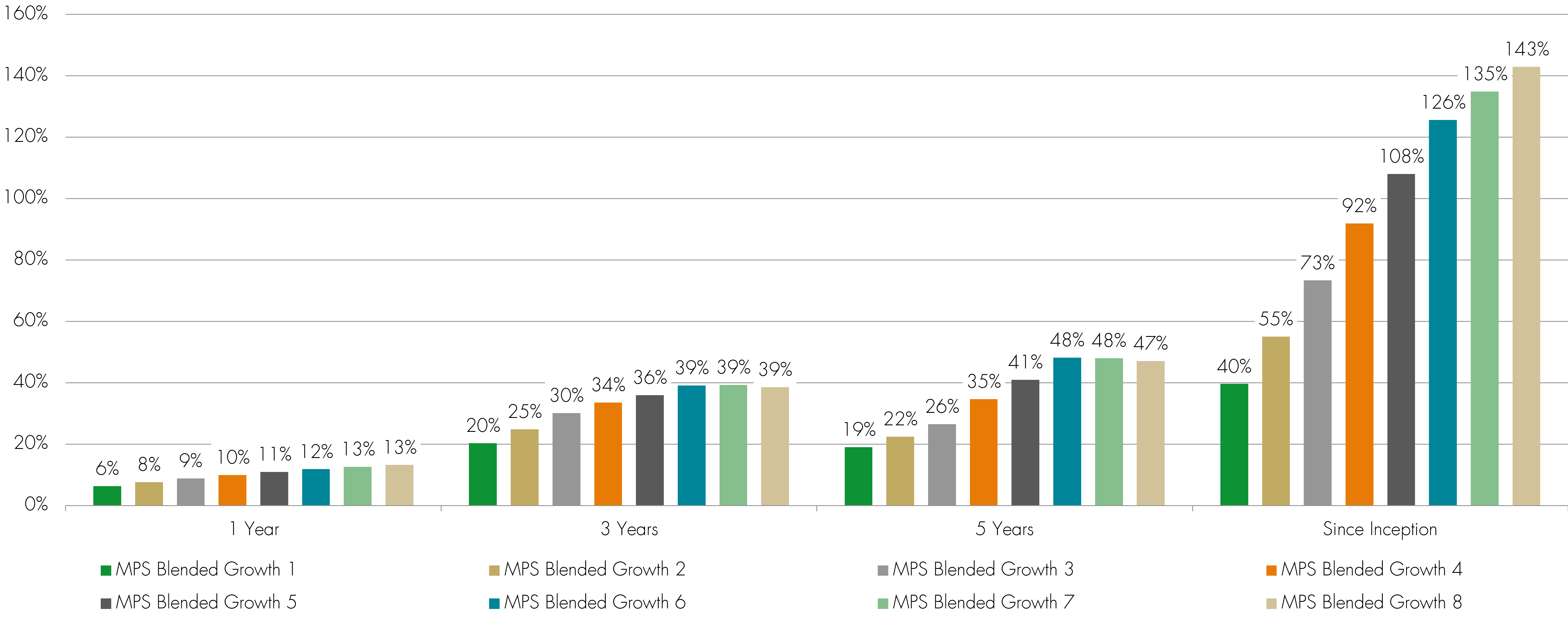 The Liontrust Multi-Asset MPS Blended Growth portfolio range is designed to target the outcome expected by investors in terms of their level of risk, as measured by volatility, and maximise the return for each portfolio within the appropriate risk band. The higher the risk of the portfolio within the range, the greater the potential for volatility, positive returns on the upside and losses in down markets.