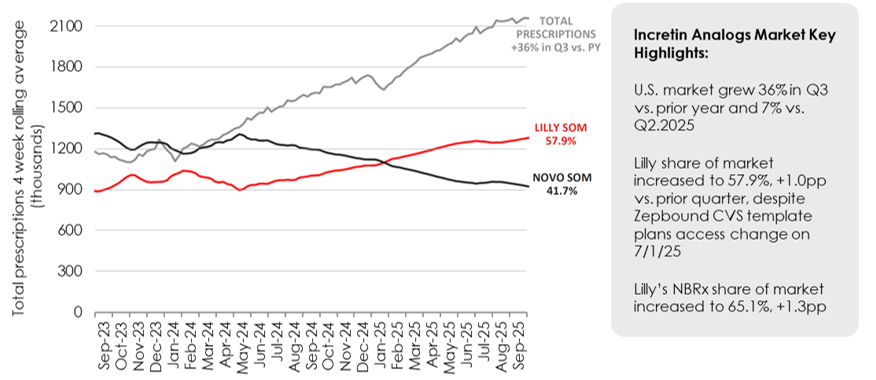 Lilly’s Q3 results were very encouraging: topline growth accelerated to 54% year-on-year, while earnings beat expectations by 23%. For the fifth consecutive quarter, the company gained market share in the US incretin analogues market and continued to take share internationally. Management has consistently emphasised the importance of execution at scale in a market that could ultimately reach tens or even hundreds of millions of patients, an area where Lilly’s manufacturing investment and operational discipline provide a clear competitive advantage.