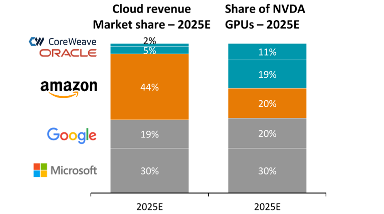 We see Oracle as a structural winner in the AI era. Technology platform shifts consistently reshuffle competitive dynamics, and Oracle is emerging as a disruptor in cloud infrastructure, particularly for AI workloads. While it holds only ~5% of global cloud revenue share, Oracle accounts for a far larger share of Nvidia GPU deployments, highlighting its strength in accelerated compute. This reflects a broader decoupling in AI, where purpose-built infrastructure is displacing legacy cloud architectures.